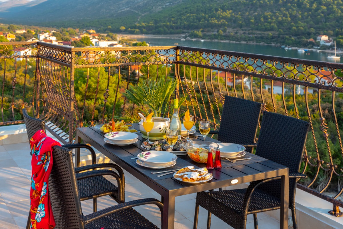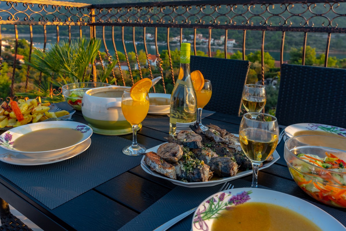 Proponujemy Państwu romantyczne kolacje czy rodzinne obiady na naszym tarasie z niepowtarzalnymi widokami na morze, wyspy i góry. Dania są przygotowywane przez naszych chorwackich przyjaciół- według dalmatyńskich receptur. Polecamy świeże ryby z grilla!